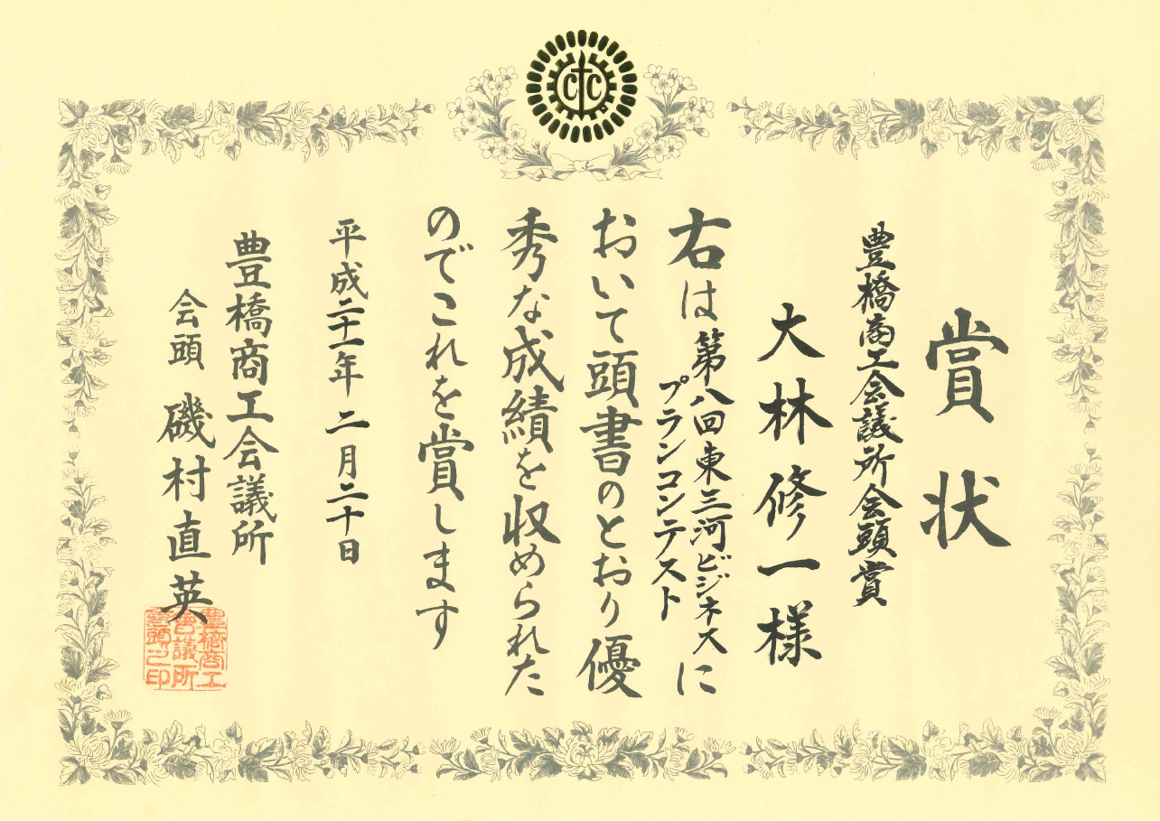第8回 東三河ビジネスプランコンテスト 最優秀賞 豊橋商工会議所 金頭賞