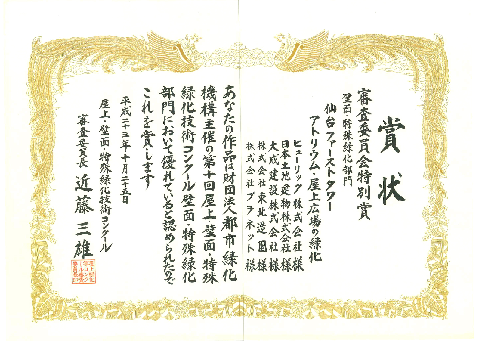 「先進緑化サービスを通じて、環境快適空間を演出する」を事業テーマに「アーバングリーンカルチャーサービス(環境に配慮した循環型生産システム)を表彰頂きました。
