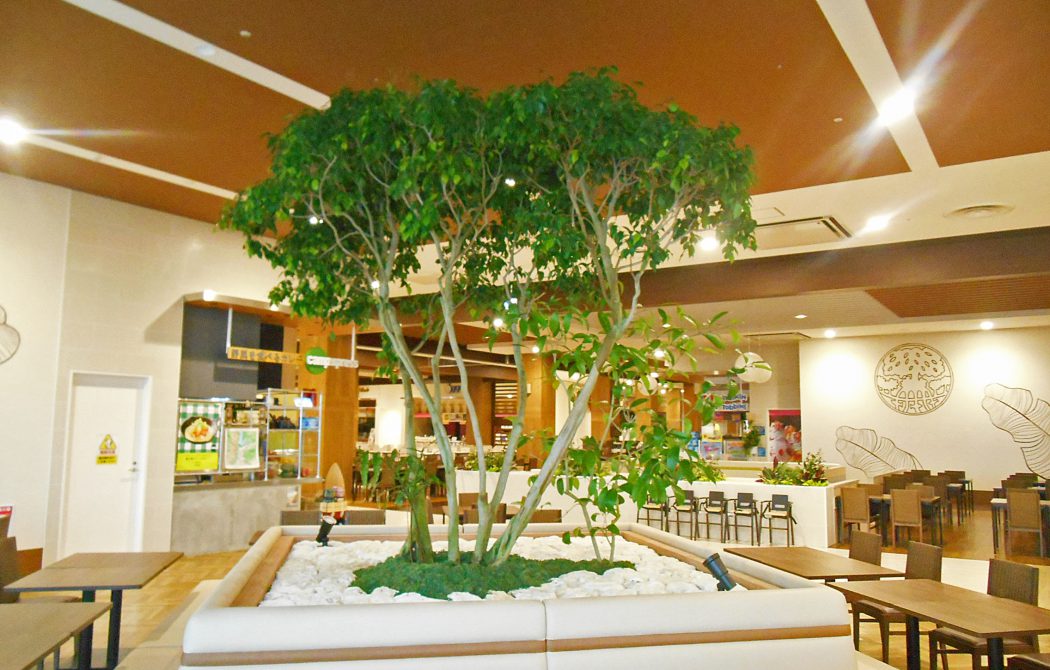 このショッピングセンターの大きな特徴として、食事を楽しめるフードコートが随所に設けられ、植栽によりくつろぎの空間を創造しています。地元沖縄や世界各国の料理まで、観光地らしく、全てのお客様に満足してもらえるバリエーションを誇ります。