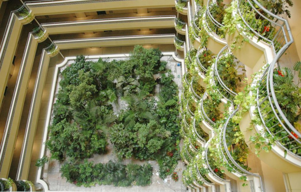 エントランスからロビーに入ると巨大な植栽が宿泊者を迎えます。中央の植栽は上階から階段から繋がっており、植物を様々な角度から楽しむこともできます。
