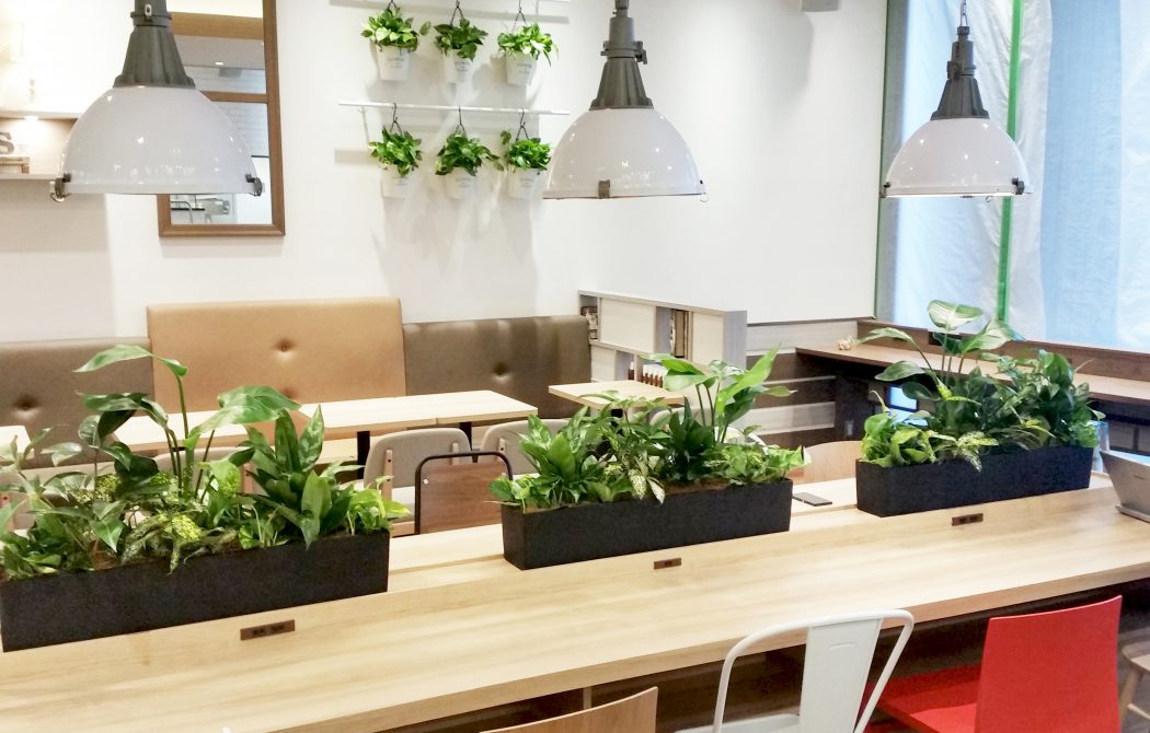 その空間に彩りを添えるにあたり、土を使わず清潔感がある当社のグリーンをご利用いただいています。