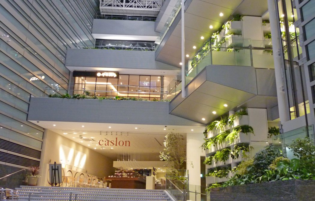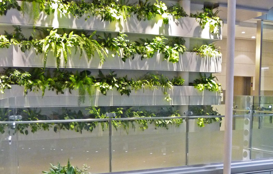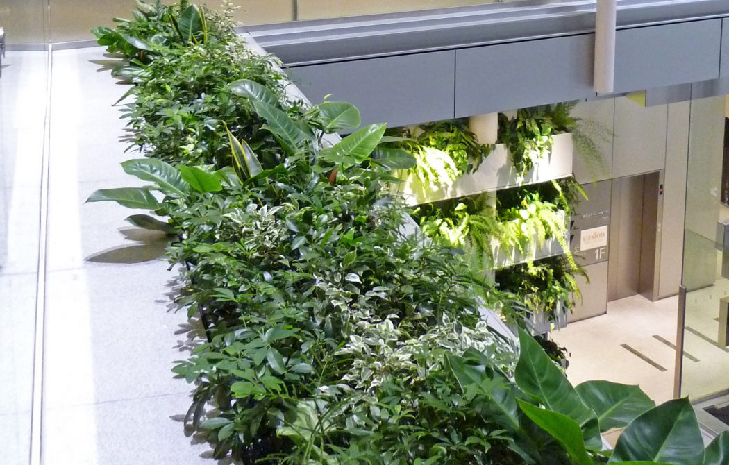 横に並んだ植物は、全て内部に水が循環する自動給水システムが導入され効率的に管理がされています。施設は、オフィスとショップを兼ね備えた複合施設で、利用者全ての人が四季を通してみずみずしい緑が楽しめる緑化空間です。