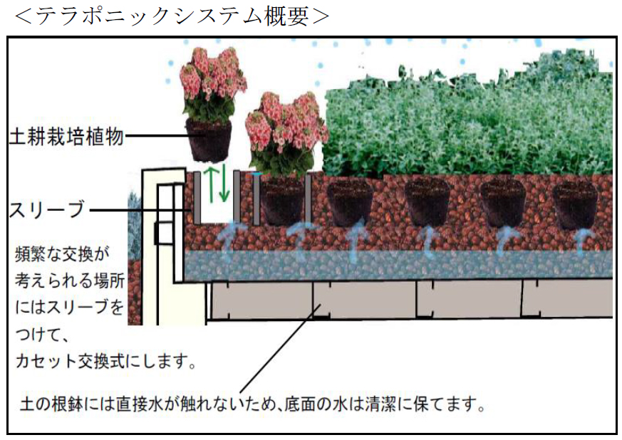 この植栽では、観葉植物を中心に行いますが、それに加えて四季を彩る草花を利用しています。持続性のある観葉植物はハイドロカルチャーで行いますが、草花等鑑賞期間の短いものは土の植物を利用しています。 その為、異なる性質のものを等しく管理するため、テラポニックシステムという独自のシステムを一部に用いています。