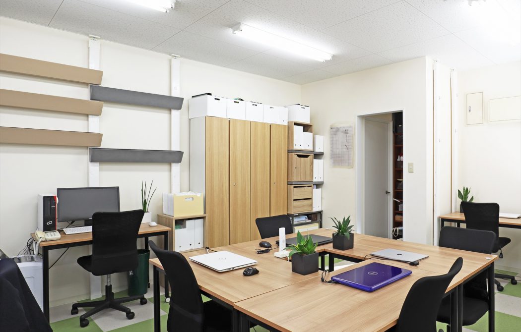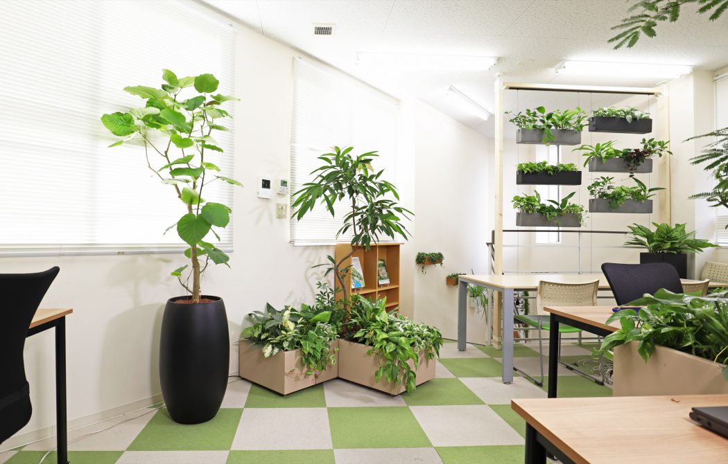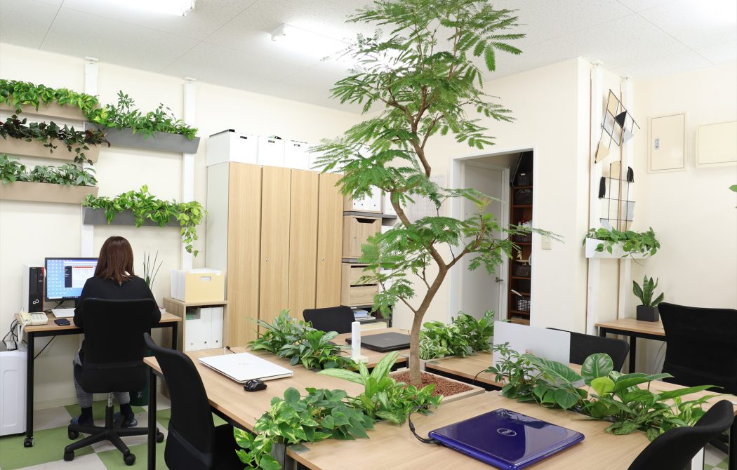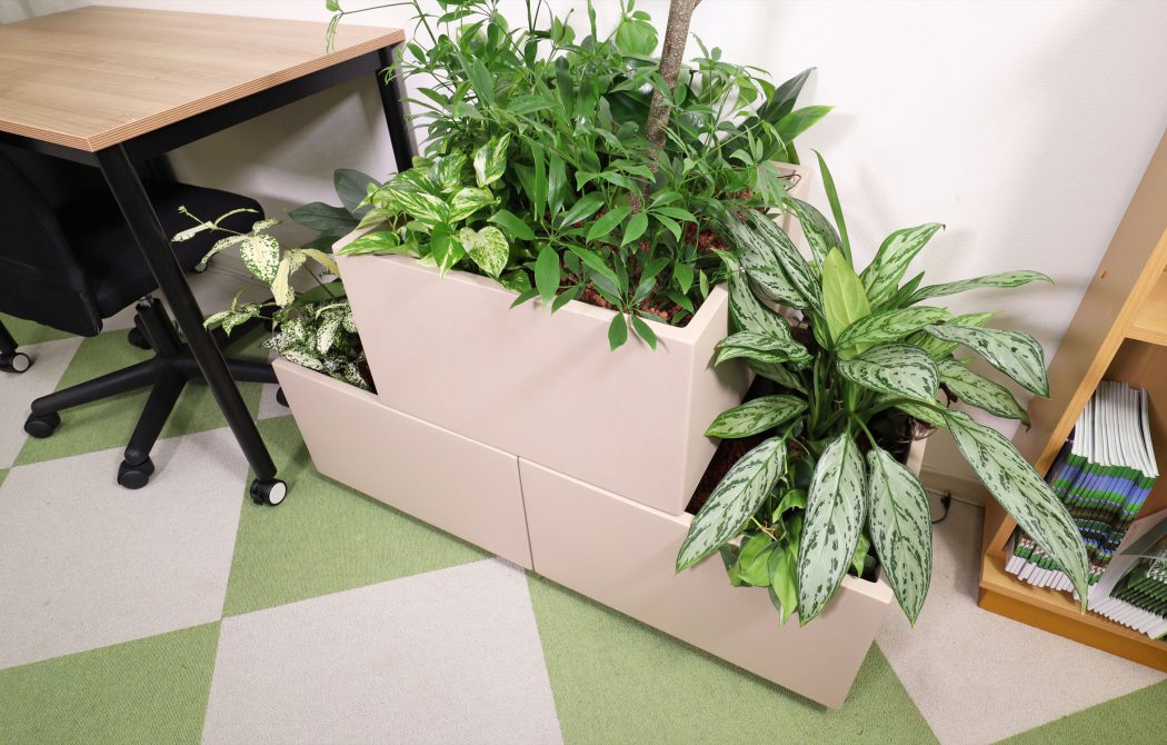 デスクとデスクの間には、薄型のプランター(みどりネスト)を配置し、快適なデスクワーク環境を作ることができます。