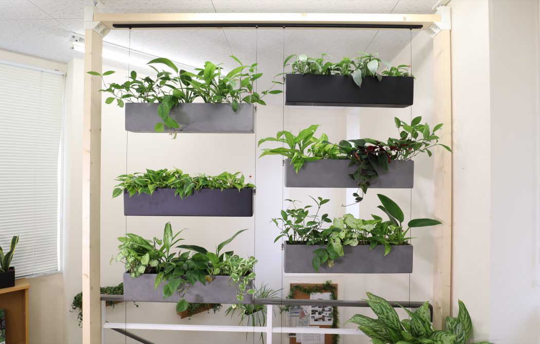 一般的な壁面緑化は大型で、専用の潅水設備など、大掛かりなものが必要になりますが、これは、1台単位で自由に取り付けが可能で、軽量の為荷重の負担も少なく済みます。デスク周りの緑化も合わせ、空間全体に立体的な緑化を行うことができます。