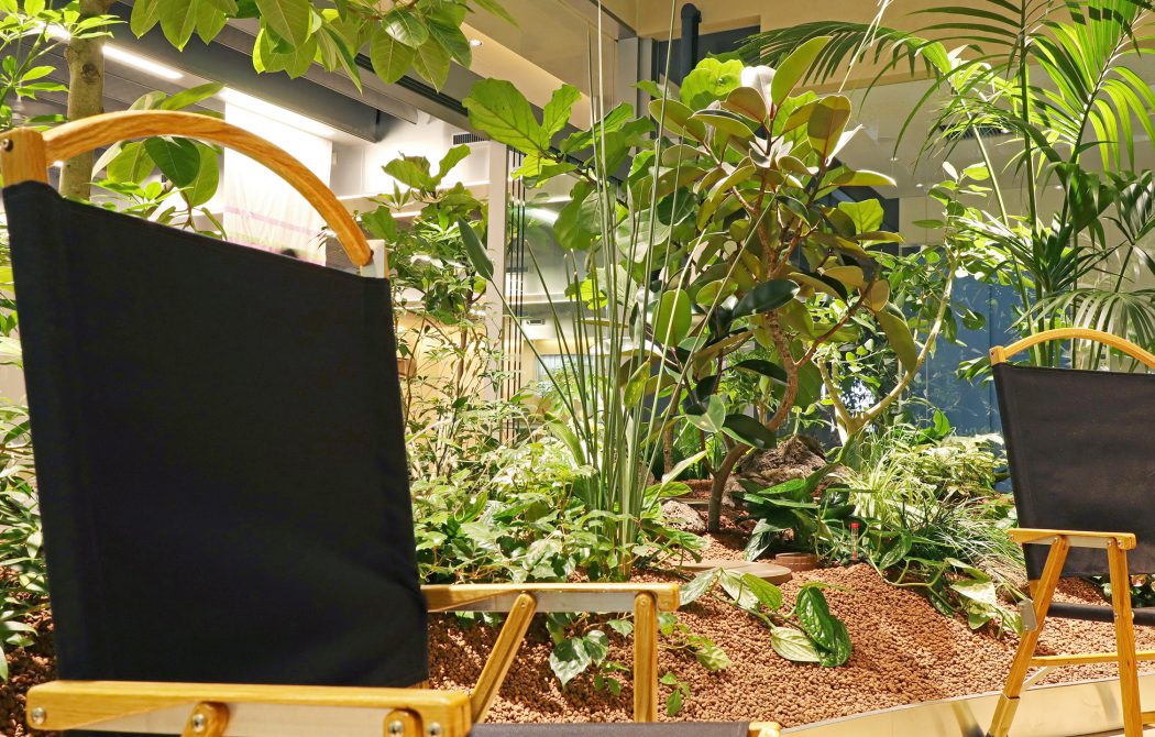 一般的に室内緑化における土壌は、植栽槽に対してフラットですが、ここではあえて盛り上げることで、