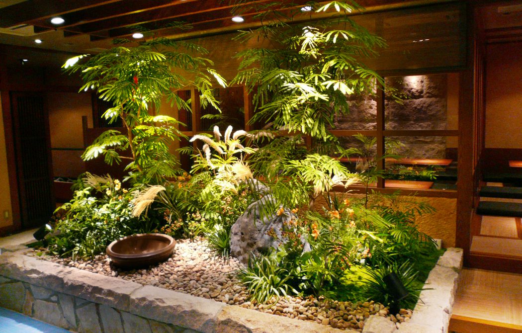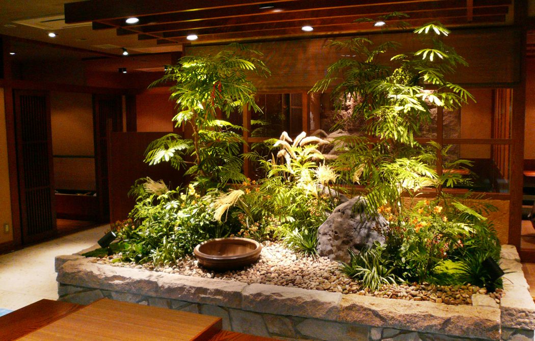 店内の奥には大人数を収容できる宴会スペースがあります。 その手前、店舗の中心にはライトアップされた植栽があります。 どの場所からも目にしやすい場所に配置され、空間にゆとりをもたらすと共に和ませてくれます。