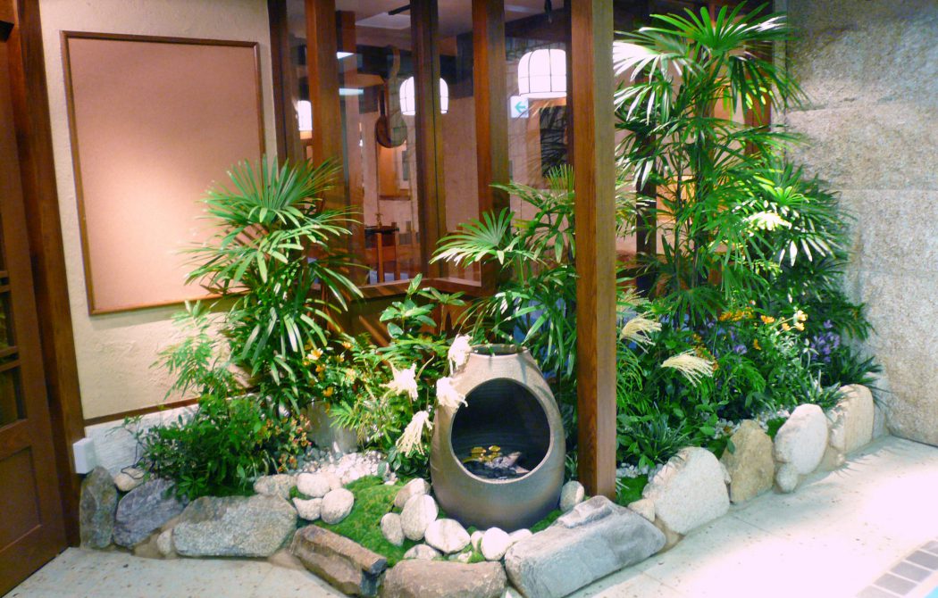 店頭では坪庭をイメージし、和の趣の強いシュロチクを中心にコーディネートしています。
