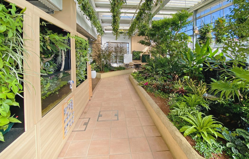 植栽槽の深さは、床面と同じで、わずかな土厚で無駄な圧迫感が無い緑化を実現しています。