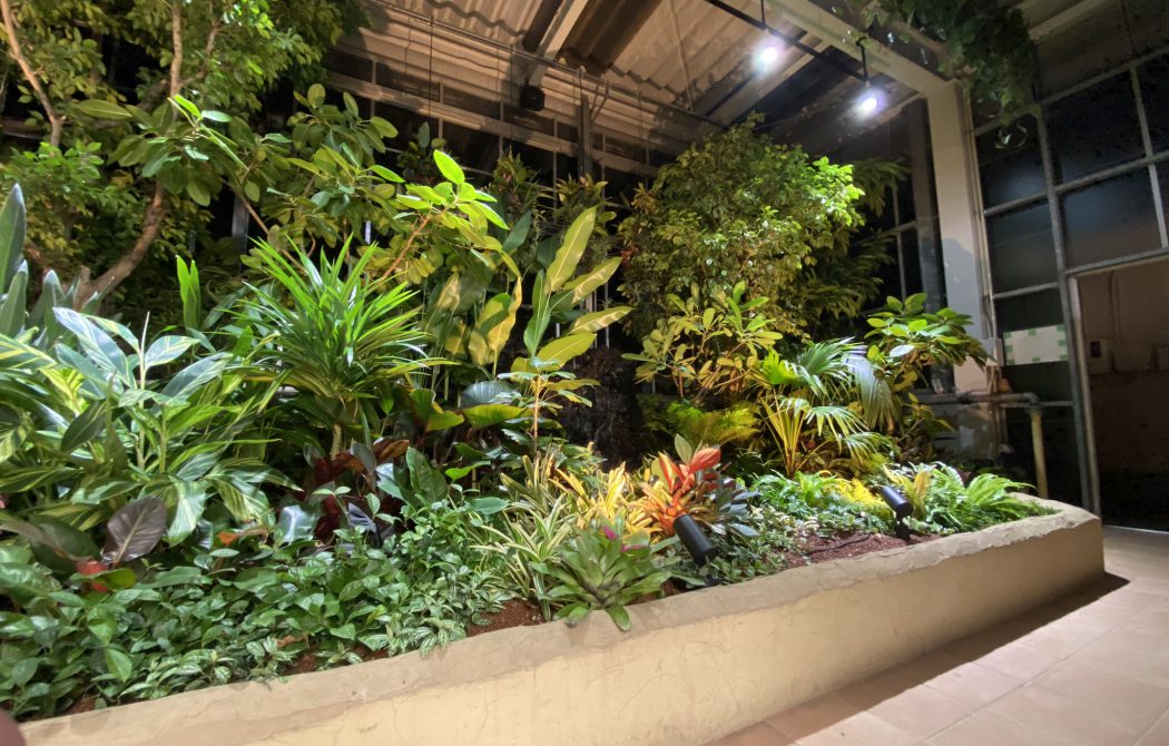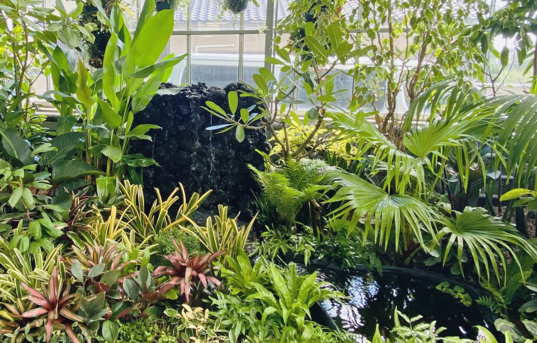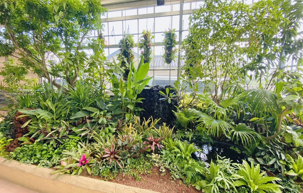 防水加工を施した巨大な植栽槽に高さ4m程の高木をシンボルに実際の植生活かしたデザインの室内庭園。