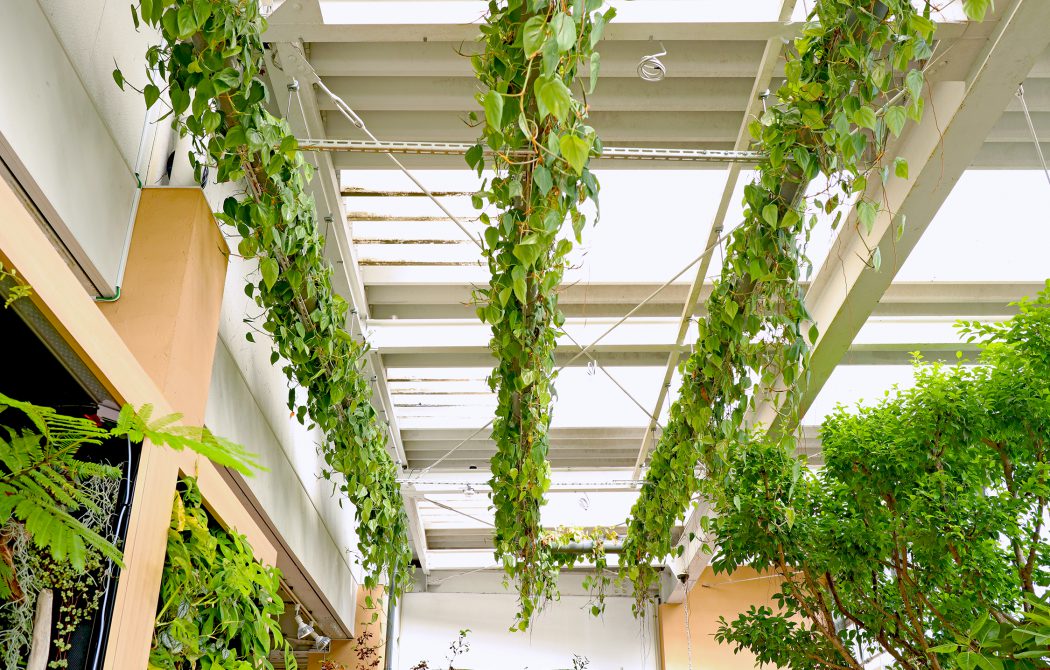 天井面を緑化すると、床や壁などの緑化も含め空間全体を植物で包みこまれるような空間が体感できます。植物は、成長に伴い、草丈を伸ばすことで、時間の経過とともにより豊かな緑の空間へと発展していきます。
