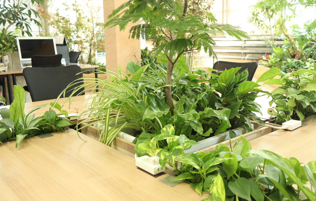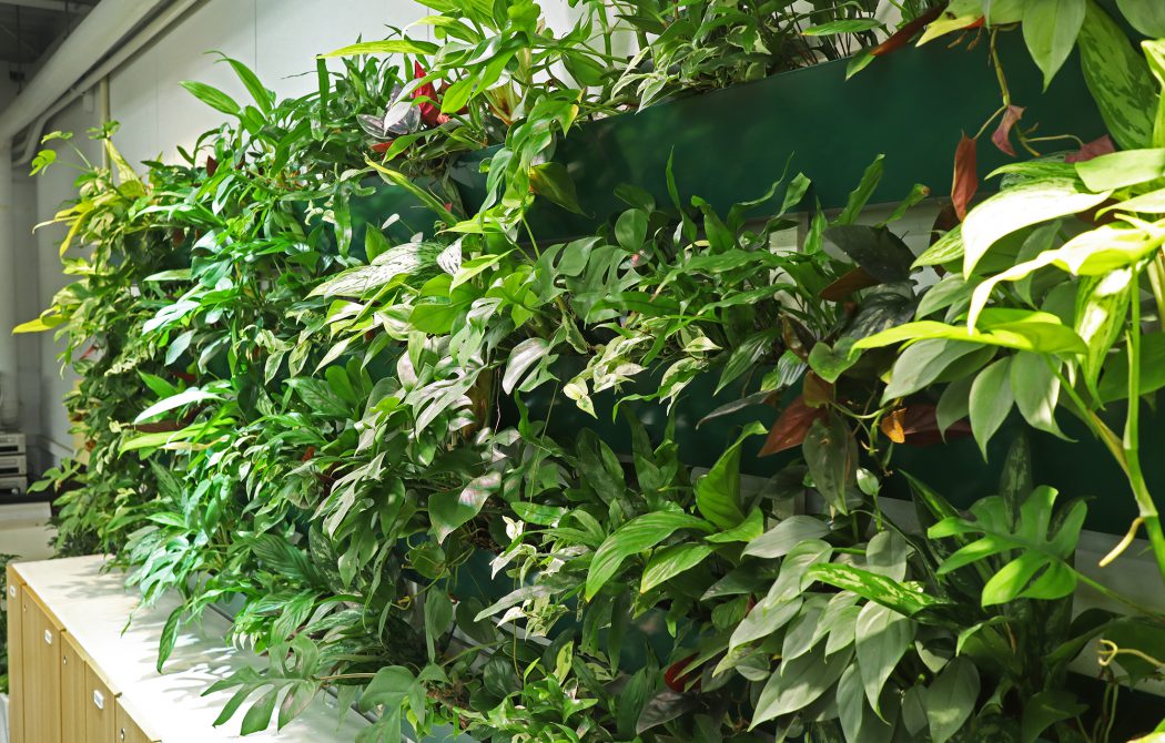 視界に入る高さ140cm前後、収納キャビネット上に壁面緑化をすることにより、導線や視界を妨げずに立つ・座る・移動するといった行動の中で無意識に空間に溶け込んだ緑を感じる事ができます。