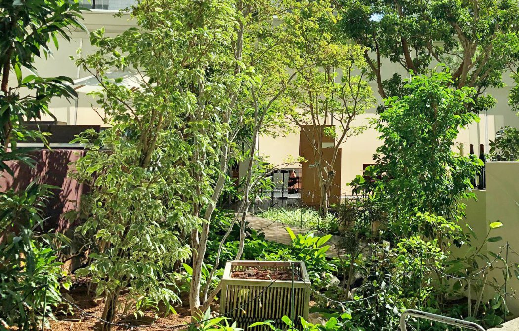 植えられている植物はベンジャミナやシマトネリコ等を中心に葉が小さく爽やかで柔らかな印象を持つものを中心に取り入れています。観葉植物でありながらも、日本の雑木林の様な自然を感じる雰囲気となっています。