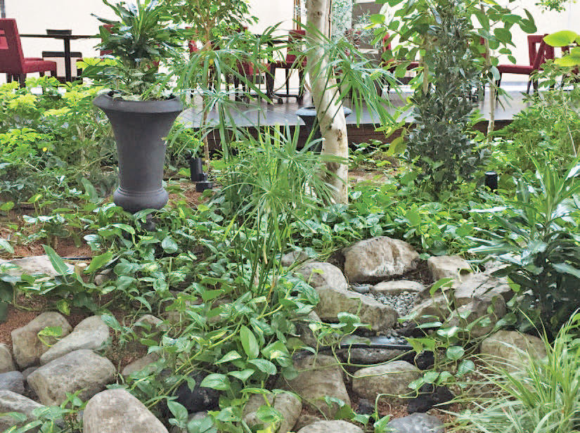 その特性を活用するために植栽槽の中に通気筒を通し、空気を循環させることにより、土壌では不可能な空気浄化システムを構築しています。