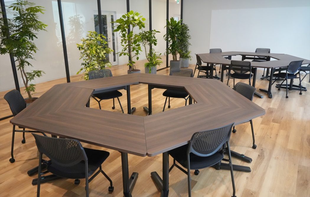 オフィス家具は、台形のミーティングテーブルで構成されており、三角形や平行四辺形、六角形など様々なレイアウトに対応可能になっています。