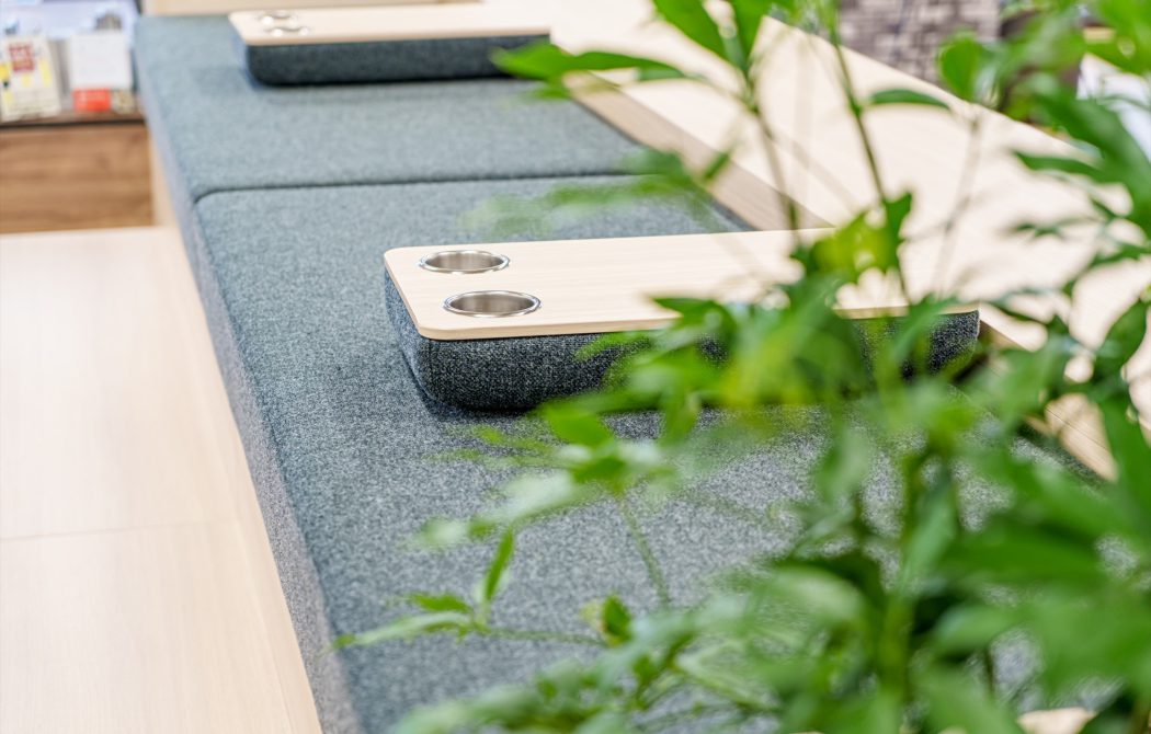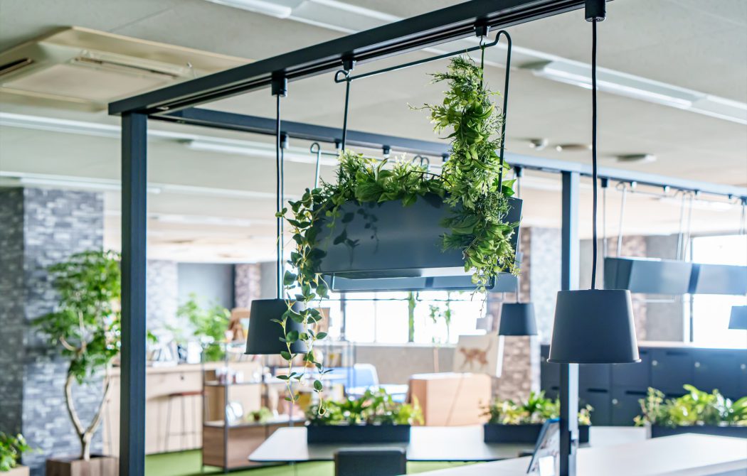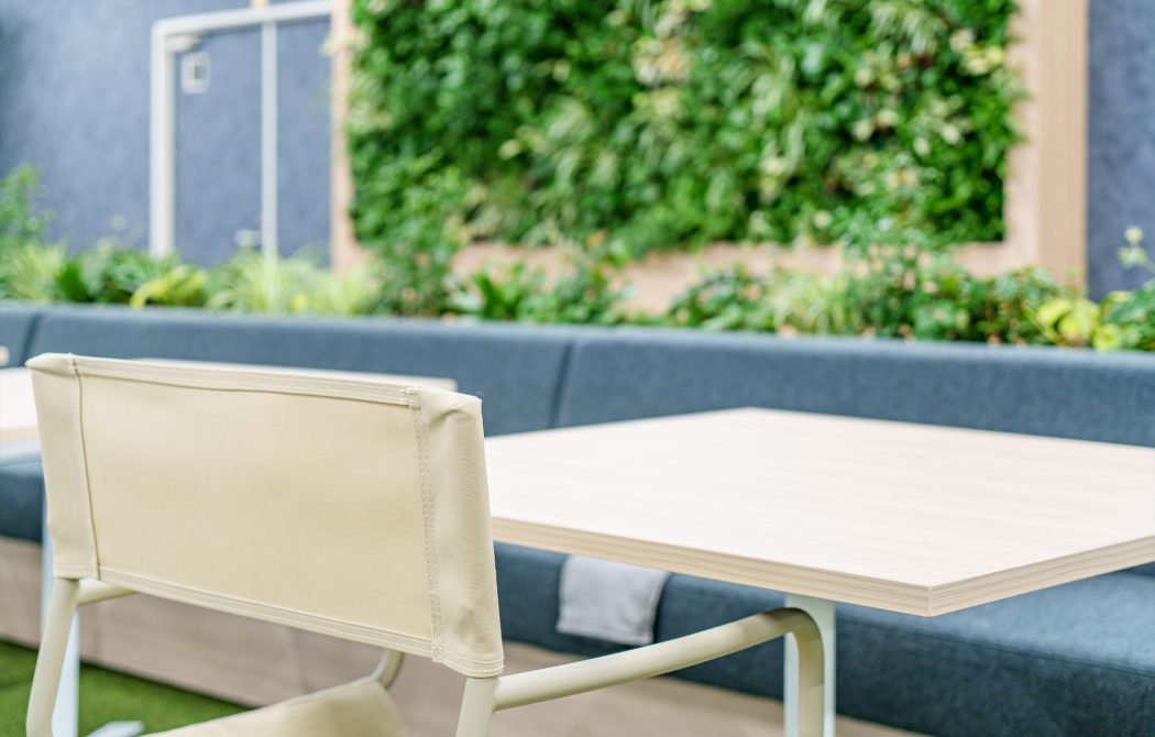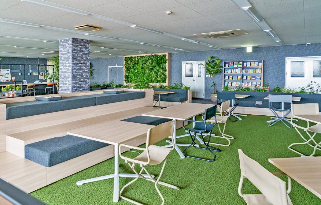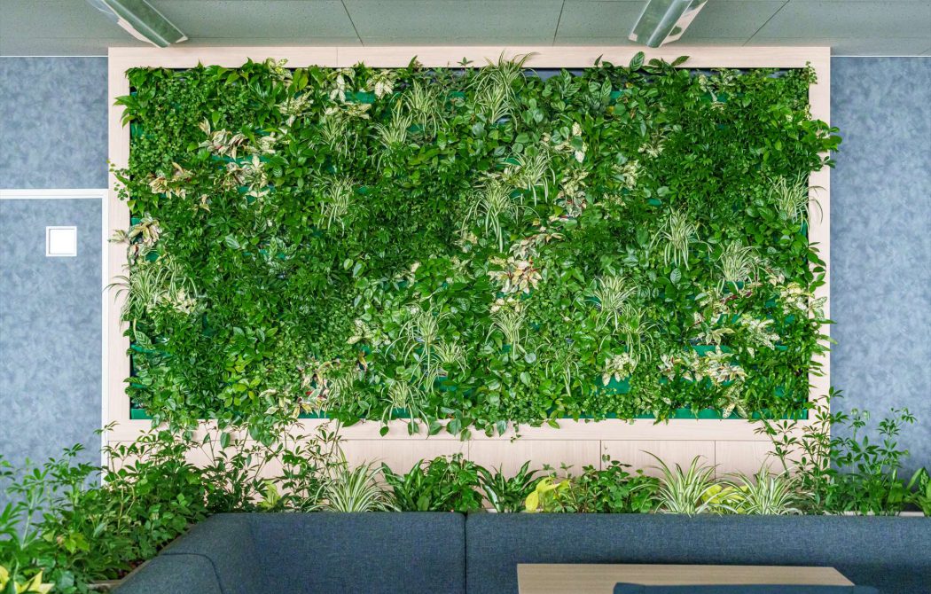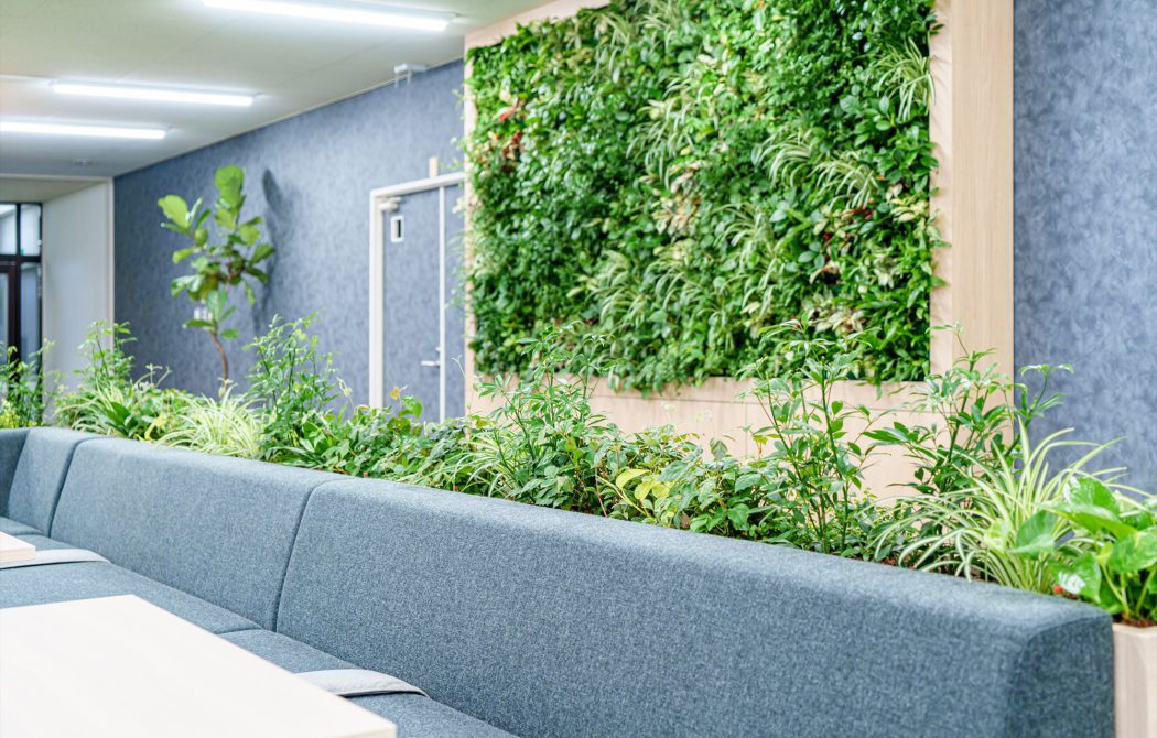 この空間のコンセプトを表すかのように、中央に大きな壁面緑化が設置されています。