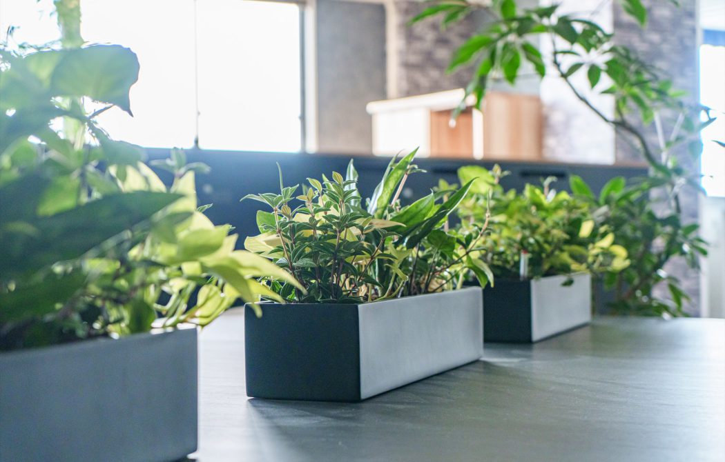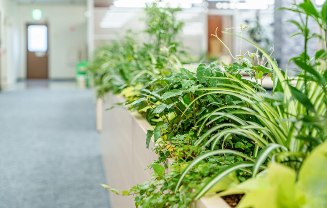植物は、インテリアに造作された植栽スペースや壁面緑化、置き鉢などがあり、全て質感は木を基調としたナチュラルなものになっています。