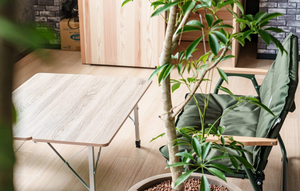 キャンプ用のインテリアを用いた場所には、木製や陶器製のプランターに、木立の植物を配置しています。