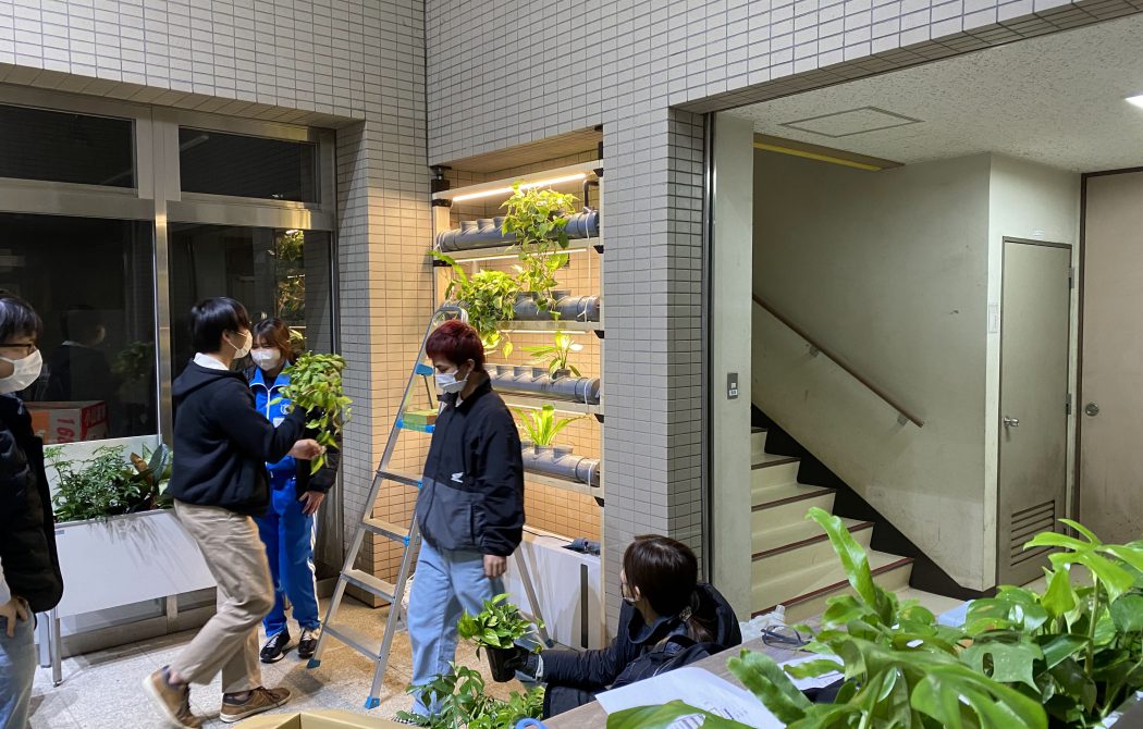 ワークショップから約2か月後、実際の施工を行いました。プランターの設置や植物の配置などは、当社のアドバイスの元、学生さん主体で作業をして頂きました。