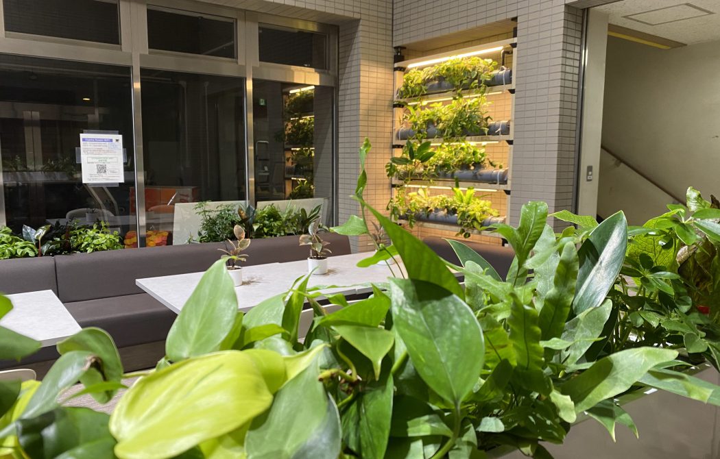 ロビーにはくぼみのある壁面があり、こちらには壁面緑化を設置しました。