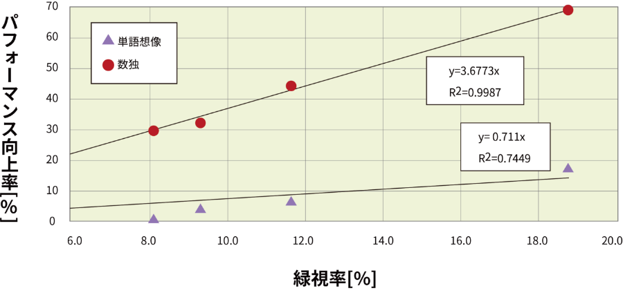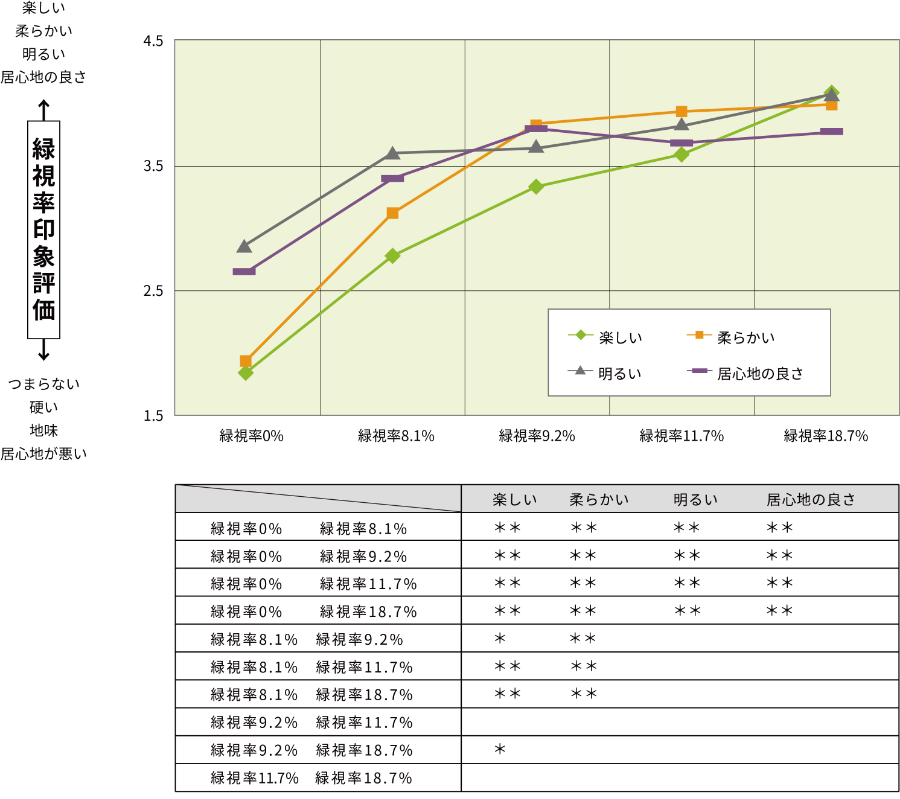 また、実験結果から、比較的狭い空間での最も効率の良い緑視率は、10-15%程度であると考えられ、また小さな植物が大きく育つ様子を観察することも良い効果を生むとされています。
