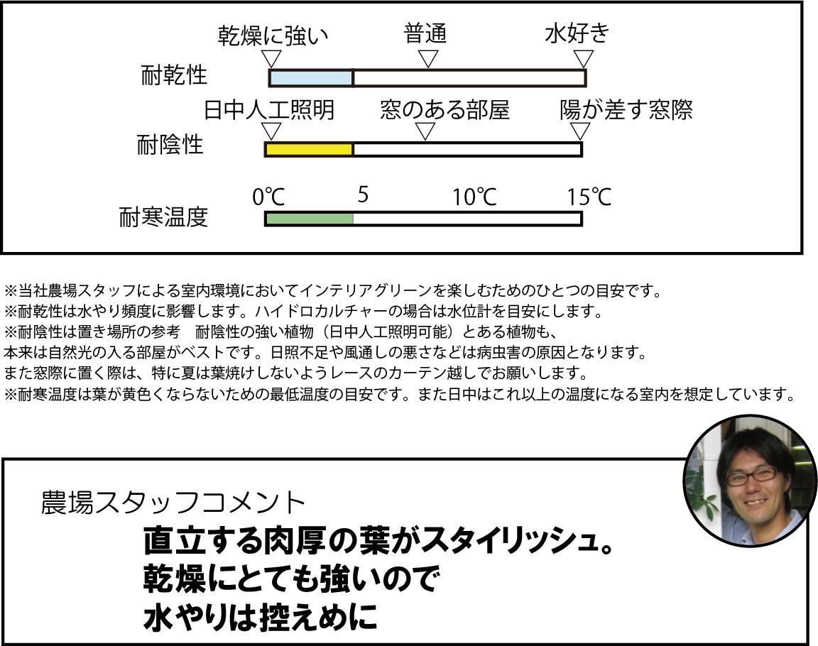 とても乾燥に強い植物です。例えばハイドロカルチャーで育てる場合、水位計が下がってすぐに水をやらずとも、元気に育ちます。あまりにも水が足りないと葉にしわが出てくるなどサインがありますので目安にすると良いかもしれません。逆に水はけの悪い土壌で育てると根腐れの原因になります。また、葉の中央に水が溜まってしまうと葉が腐ってしまう可能性がありますので水やりは土表面に行いましょう。基本的には耐乾性だけでなく耐陰性もあり病害虫も出にくいのでインドアグリーンとして育てやすい品種です。