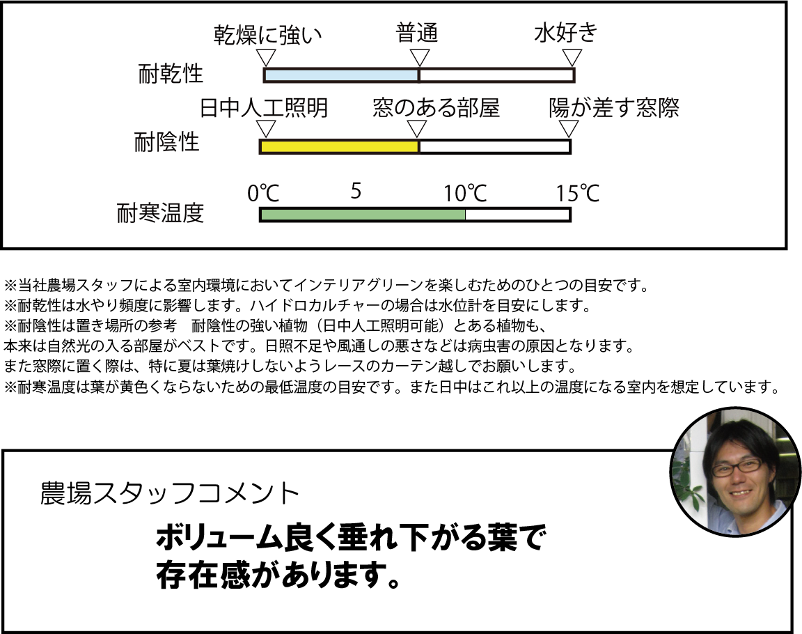 でしょう。寒さには少し弱いですので、冬場の室温に気を付けましょう。多肉質の葉で水分を貯蔵し乾燥に強いですが、空気中の湿気を好む性質があります。