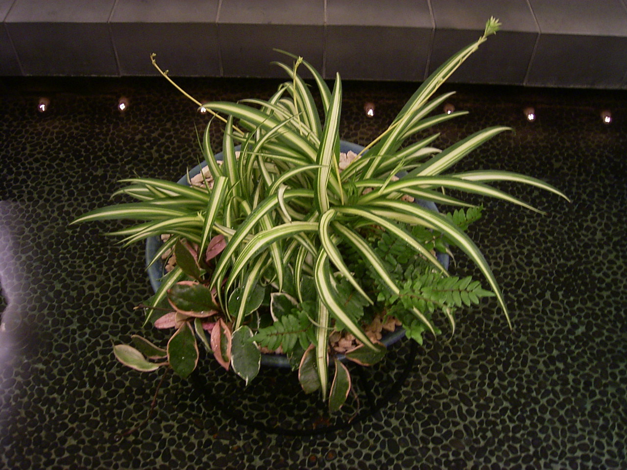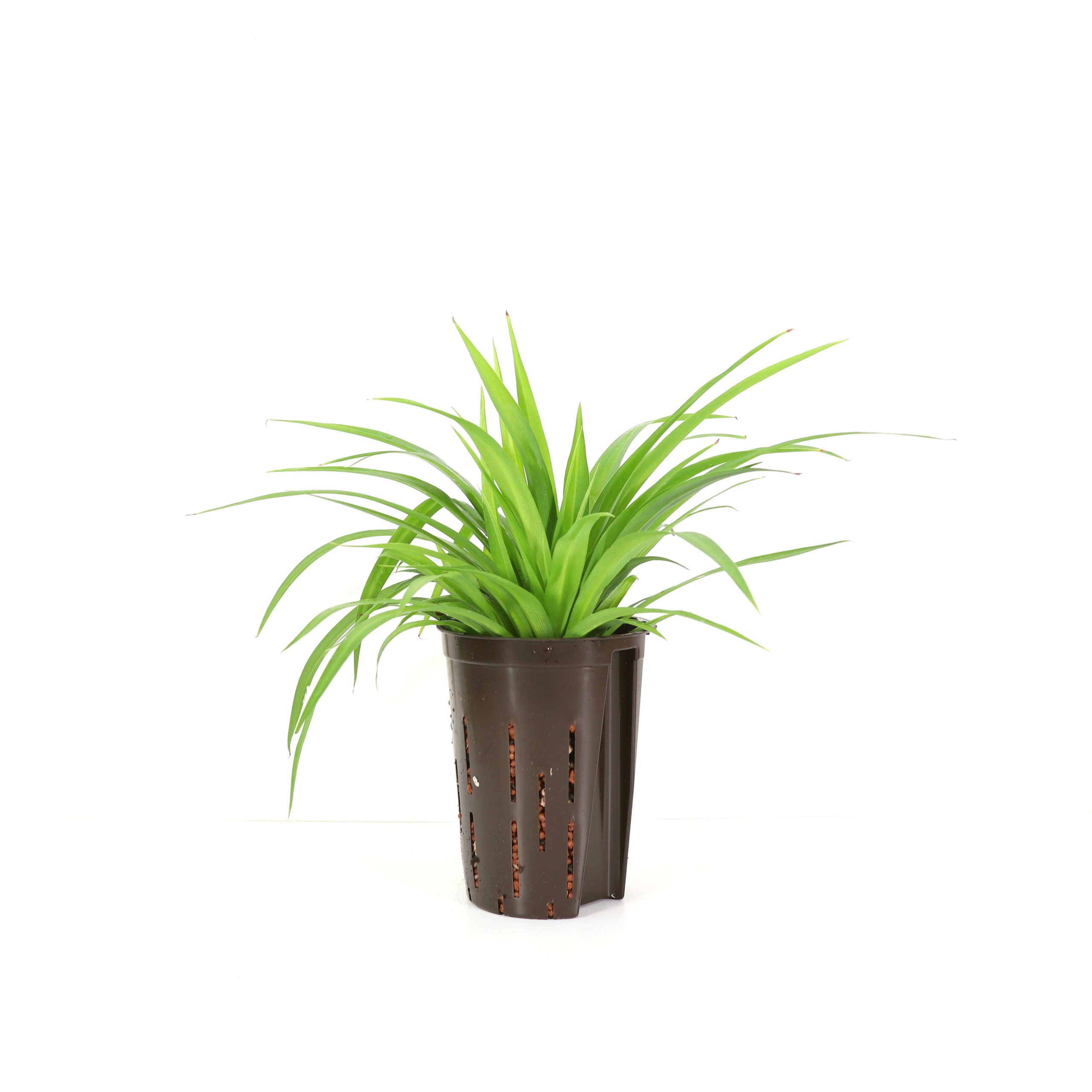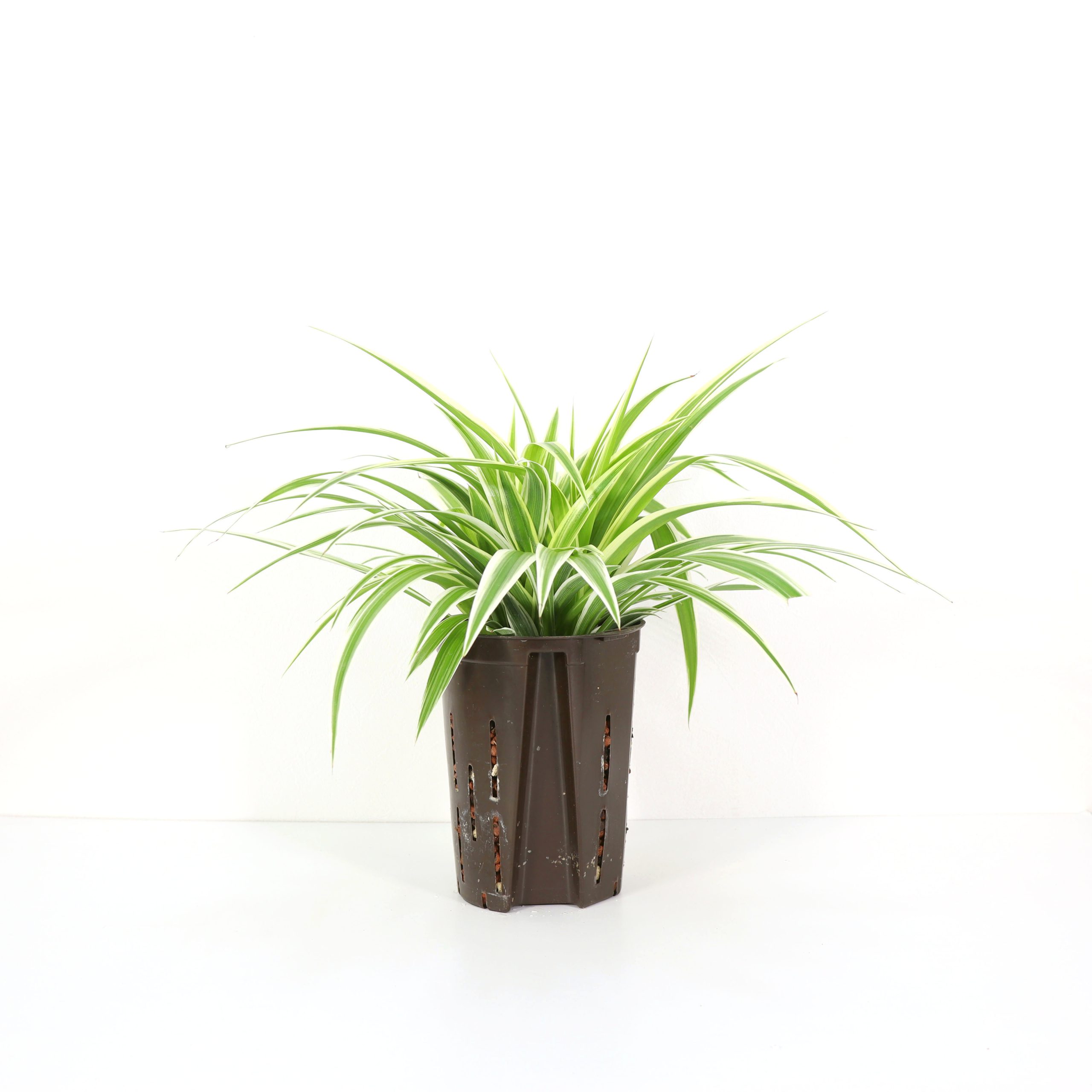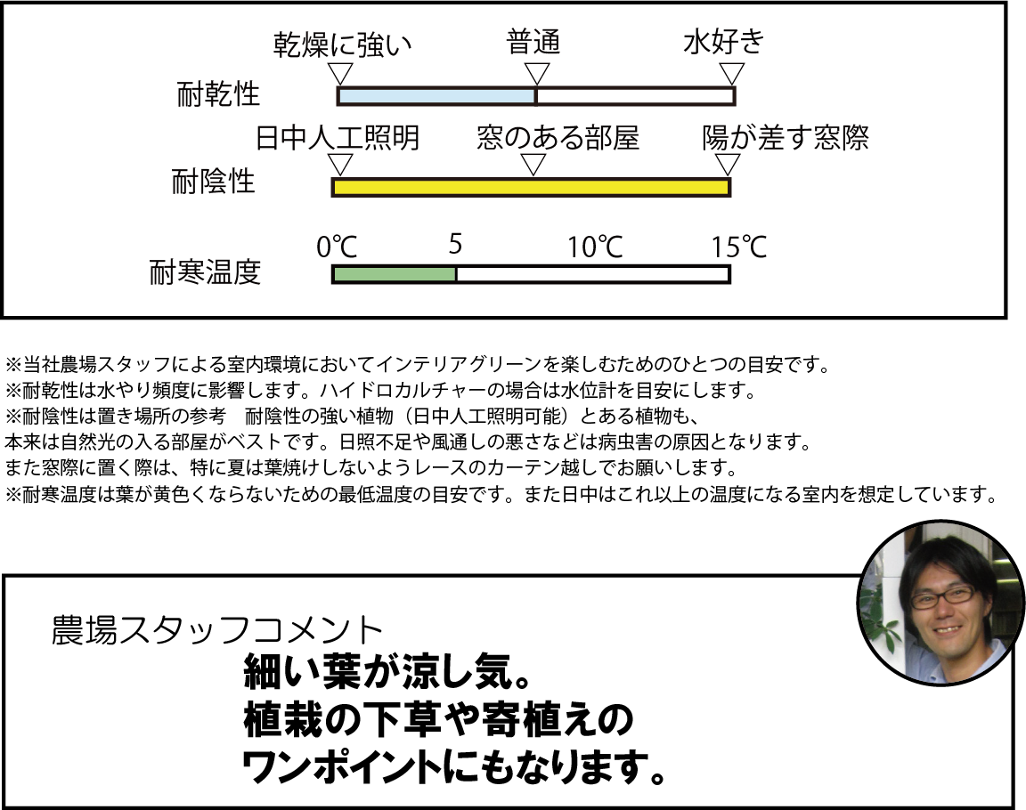 長さ15~30cm、幅1~2cm程の細長い葉の多年草。葉の間からランナーを出して新しい株が生じて増えていきます。根は白く多肉根で水を貯蔵するため耐乾性に優れ、また良く伸びます。他の観葉植物と異なる細い葉のフォルムは和の雰囲気にも合い、白い斑入りの品種は涼やかなイメージを演出してくれます。吊り鉢や、寄植え、アトリウムの下草など多岐にわたり活躍しています。