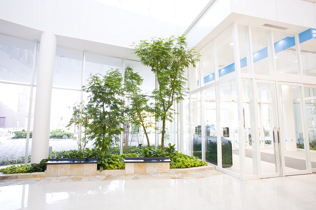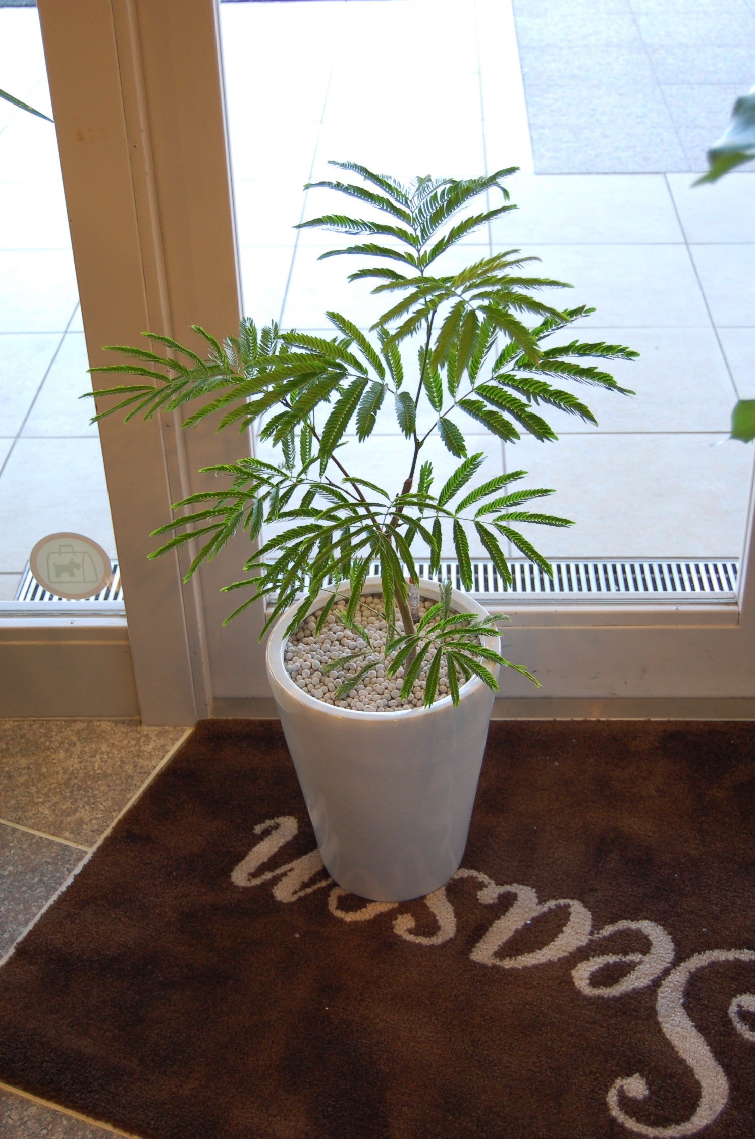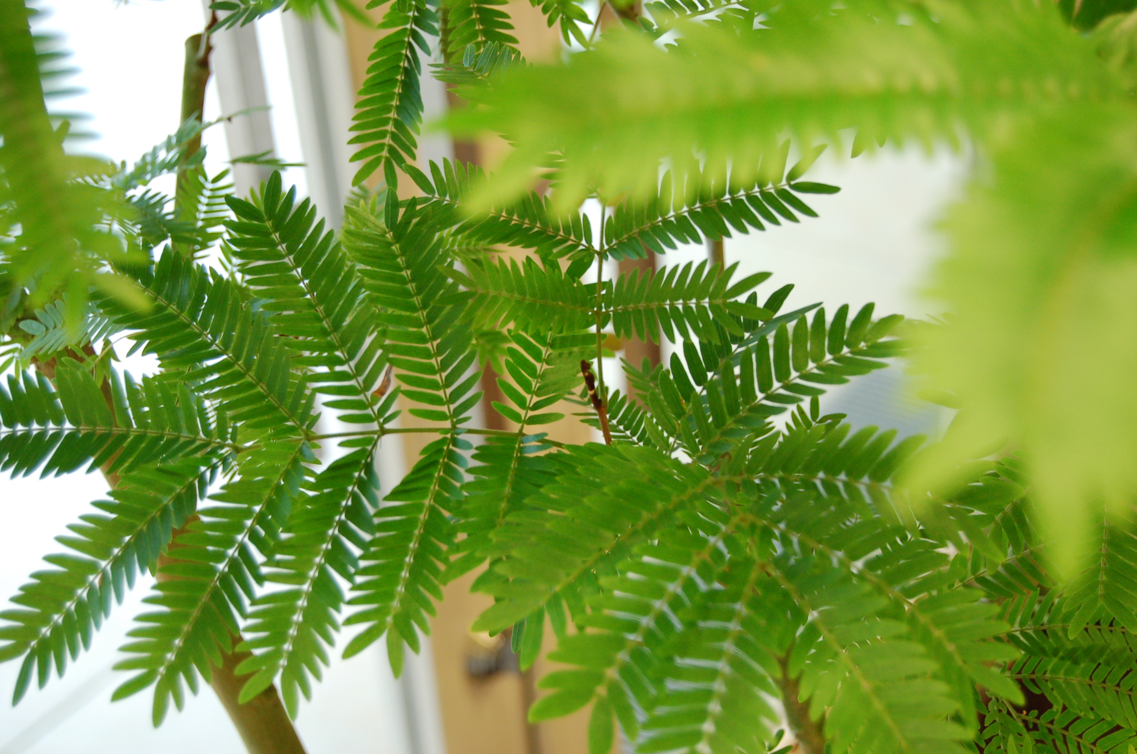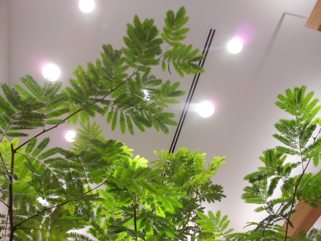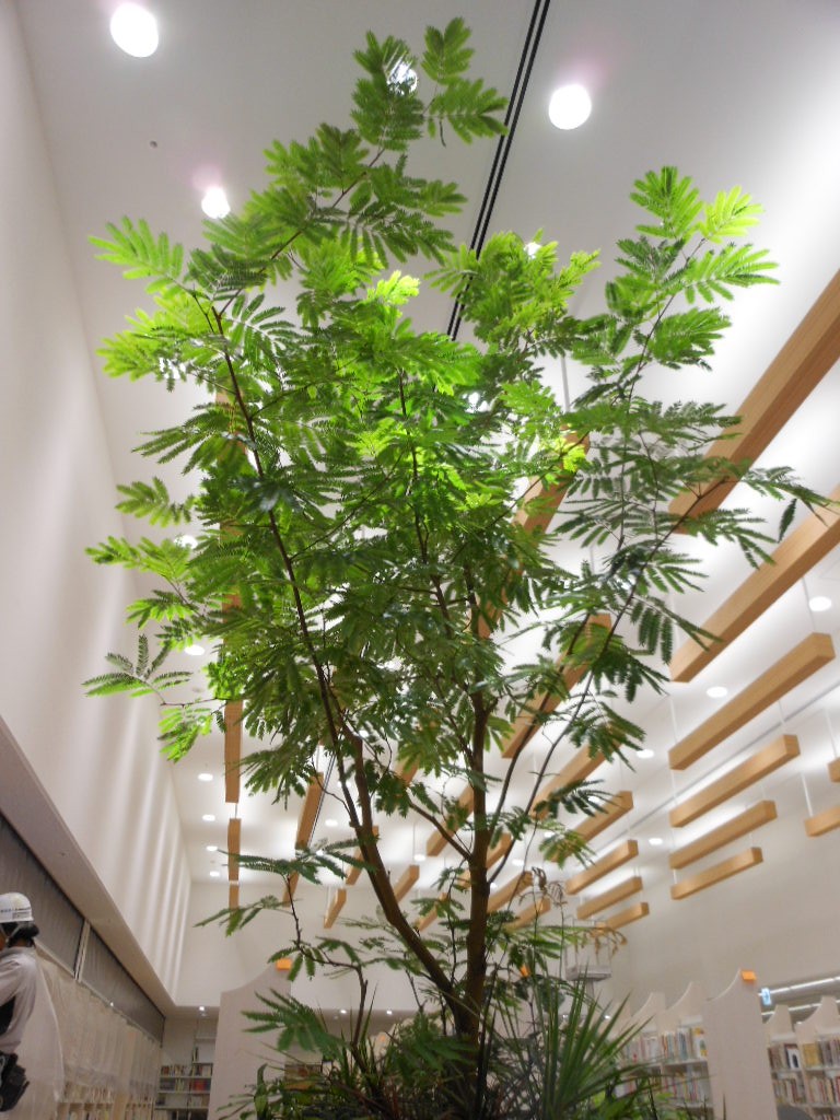 羽状の柔らかい印象の葉の樹種はインテリアグリーン(観葉植物)としては唯一無二と言って良いでしょう。リビングやお店に置くだけで木漏れ日の中にいるような演出ができます。アトリウム植栽など高木植栽としても活用されることの多い品種です。本来は樹高30m以上になる樹木です。ねむの木の仲間で、夜になると葉が閉じる睡眠運動が特徴的です。また和名「アカサヤマメノキ」とも呼ばれ、赤く長いさやができることがあります。