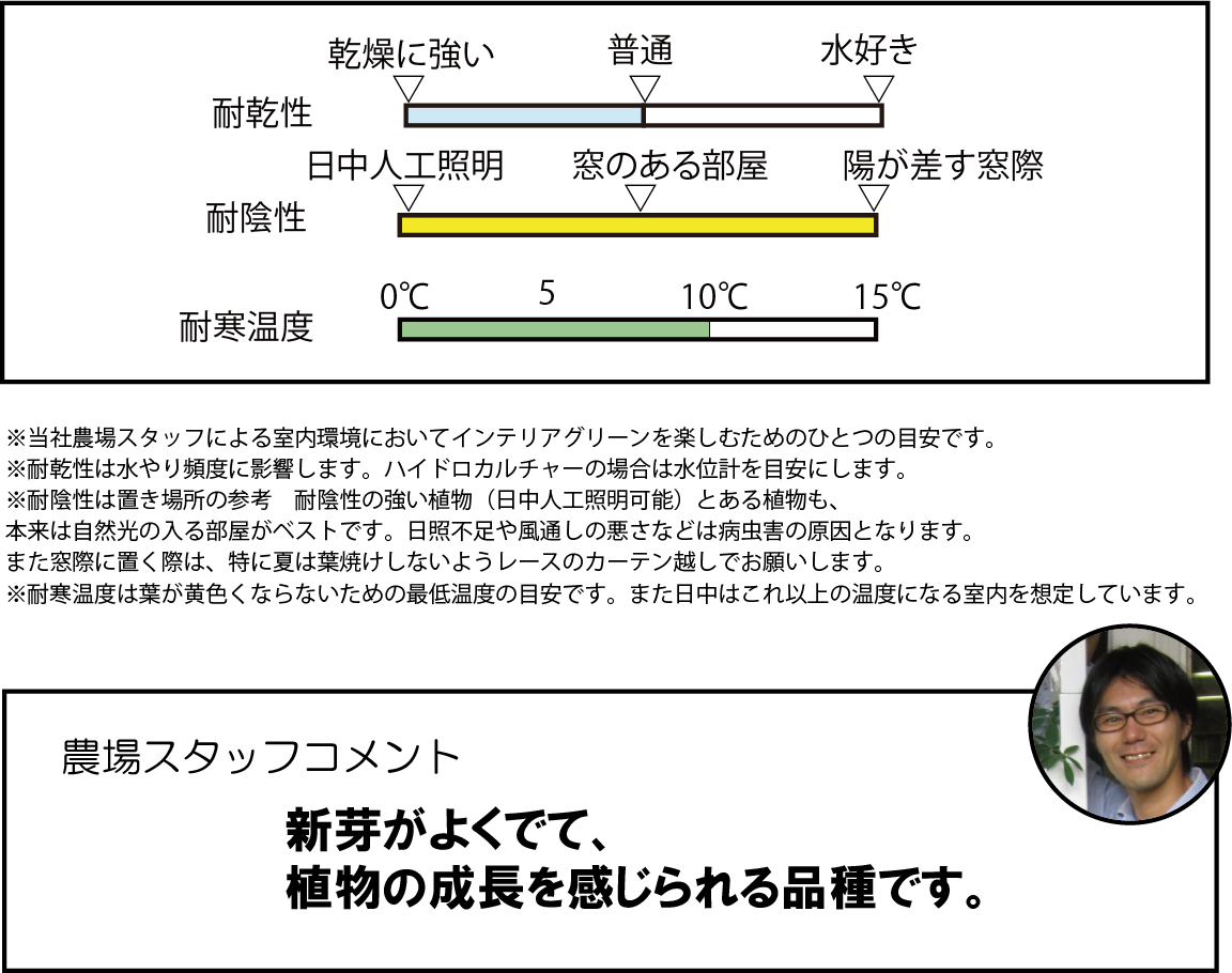 葉からの蒸散が多い品種です。水が足りないと葉が黄色くなりパラパラと落ちてきます。落ちだすと止まらない場合もあり、葉が細かいので床のお掃除が少し面倒。水やり頻度を気を付けて確認してみてください。ハドロカルチャー仕様の場合は、水位計で水やりを管理しましょう。反対に水のやりすぎは根腐れの原因になりますので注意です。