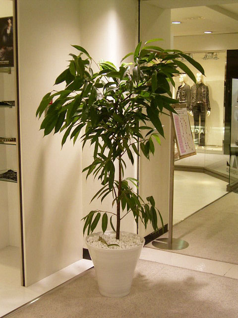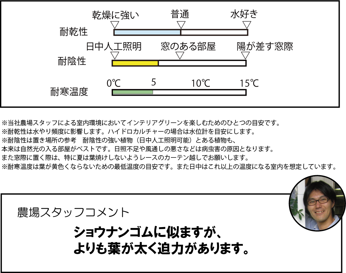 15~25cmほどの濃い緑色の細長い葉で和風にも洋風にも似合います。樹形も美しく、比較的丈夫で育てやすく多少の耐陰性・耐寒性があるので、インテリアグリーンや植栽の樹木として大活躍しています。「ショウナンゴム」や「イレグラリス」などの名前で流通している品種の仲間で、それらよりも少し葉が太く大きく存在感があります。樹形も楽しめる品種なので、大鉢以上の高木は樹形の美しいものを選ぶと良いでしょう。