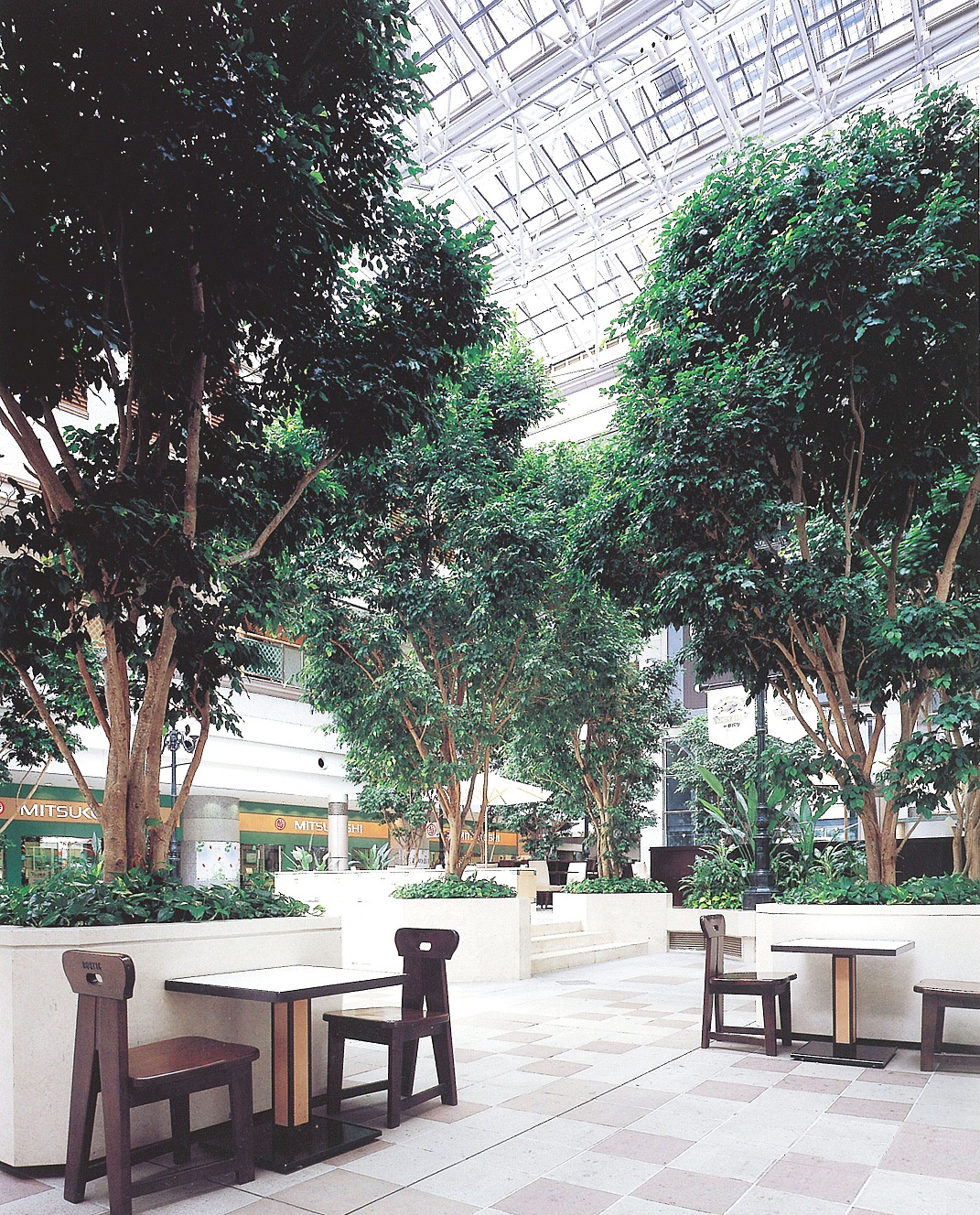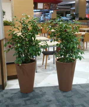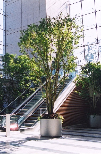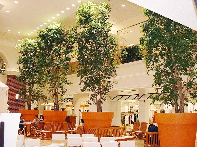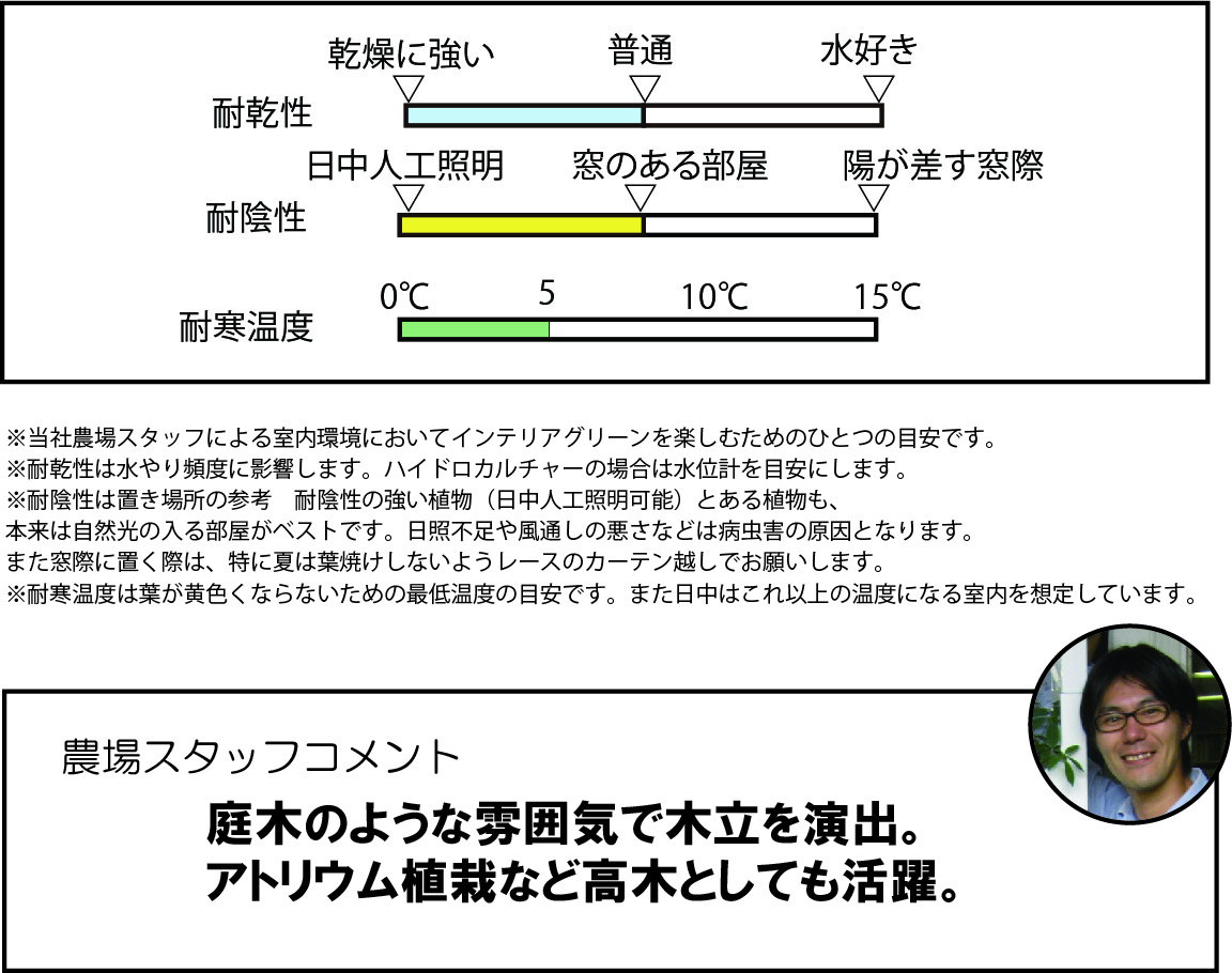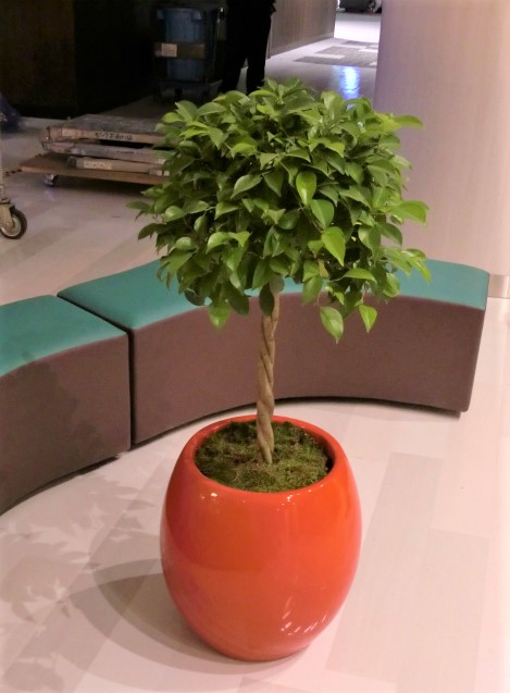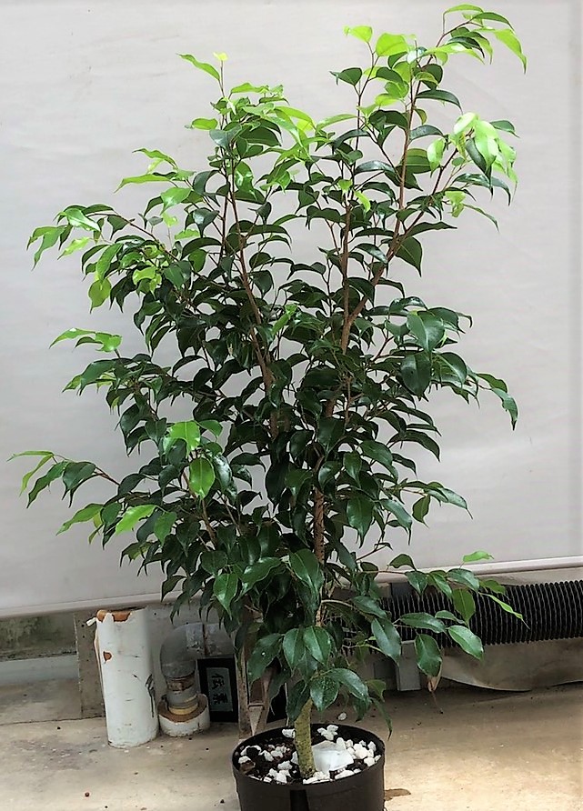 5~10cm程度の小さな葉が良く茂る定番品種。本来20m以上になる常緑樹です。薄いグレーの幹と小さな葉がインテリアをやさしい雰囲気にしてくれます。昔から家庭の観葉植物としても定番ですが、樹形が美しく枝分かれしよく繁茂するので、アトリウムの高木植栽などにもよく使われてきました。昔ほどの人気の勢いはありませんが、葉の斑入りや黄緑などの園芸品種や、トピアリー仕立てなど色々流通しています。