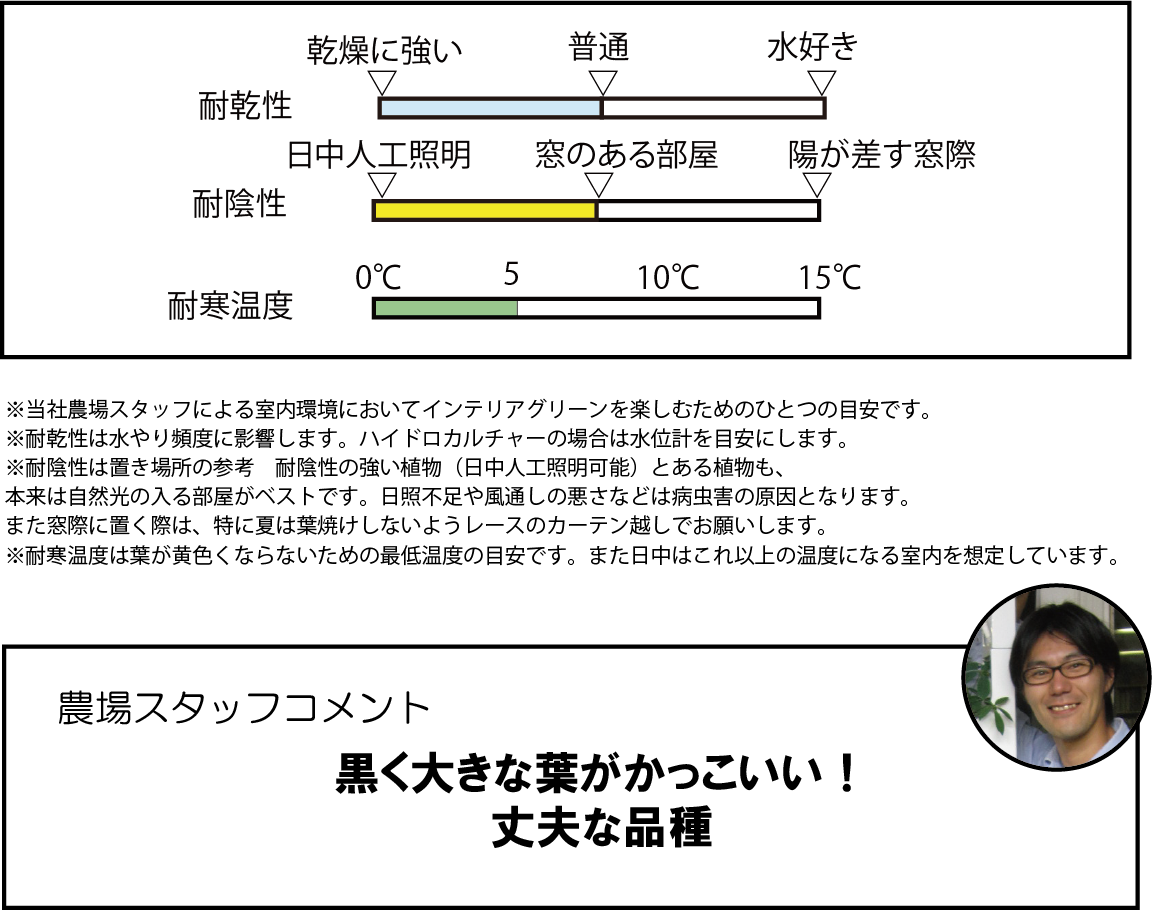 大きく濃い緑の葉なので埃が目立ちます。病虫害予防のためにもよく埃をとり、また霧吹きなどで葉を保湿すると生き生きします。