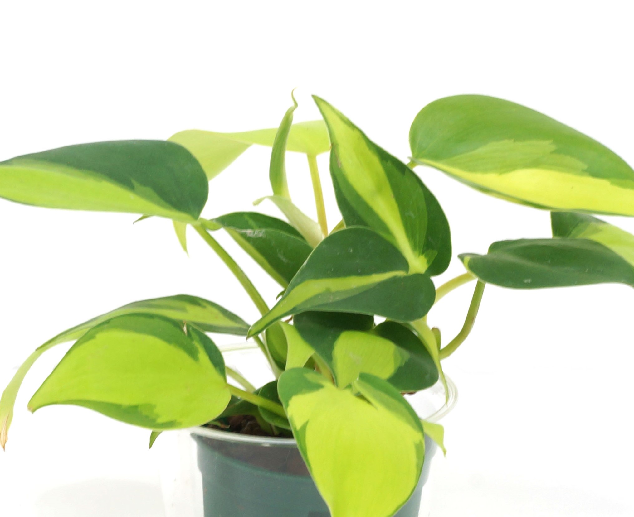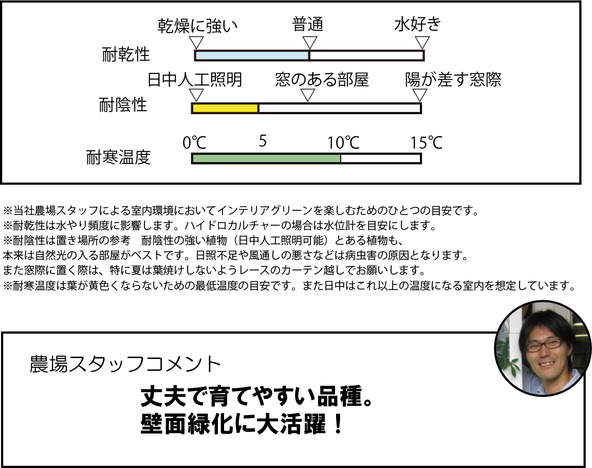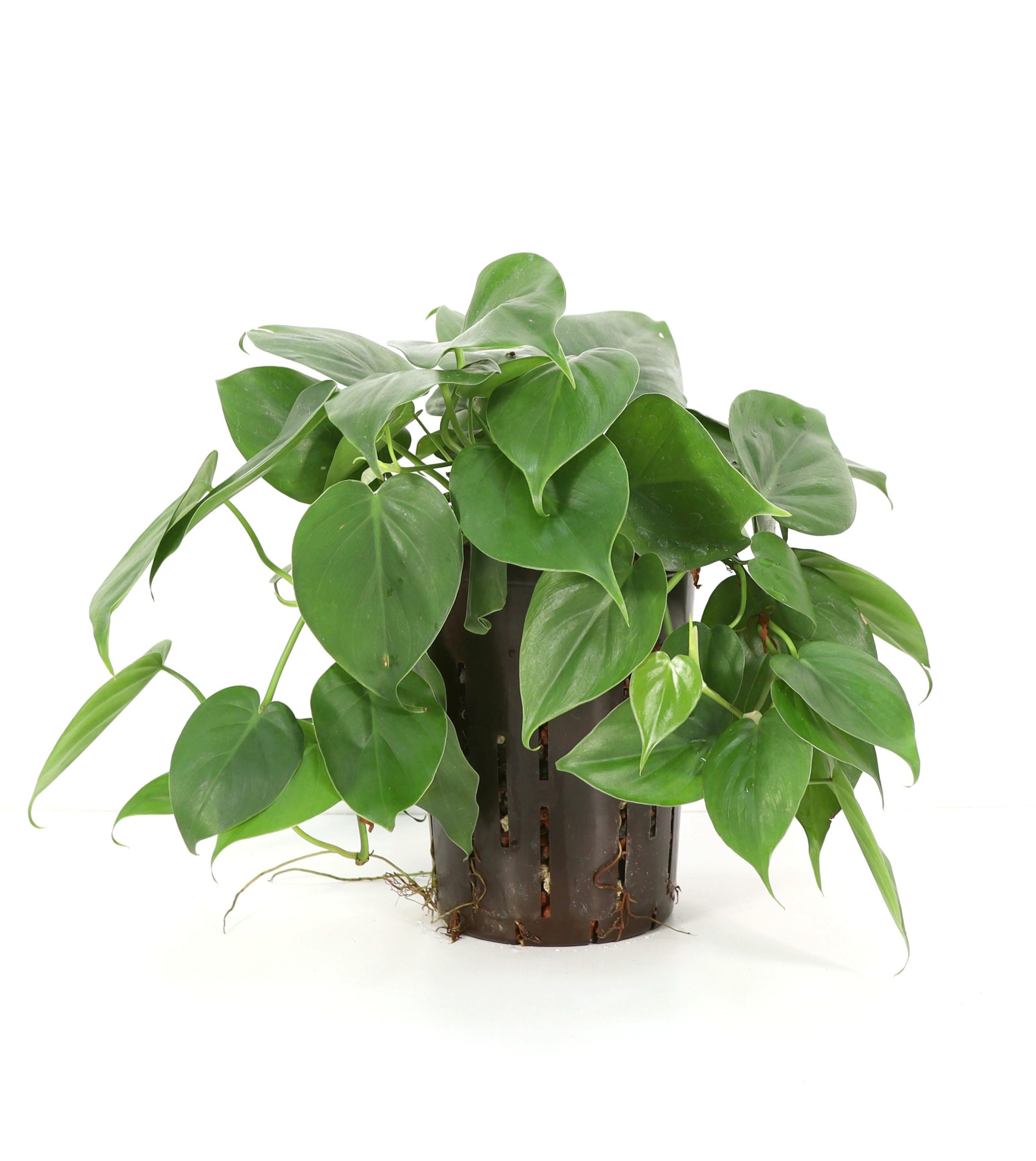 10cm前後のハート形の葉をつる性に伸ばします。やや耐陰性があり丈夫で育てやすく、インドアグリーンとして様々な場所で活躍しています。伸びたつるから葉と気根を出し、何もないと垂れ下がって伸びていきますが、近くに壁や棒などあるとそこへ着床し伸びていきます。茎は古くなると木質化します。濃い緑色の葉を基本とし、明るい黄色の'ライム’や’ブラジル’などの園芸品種があります。