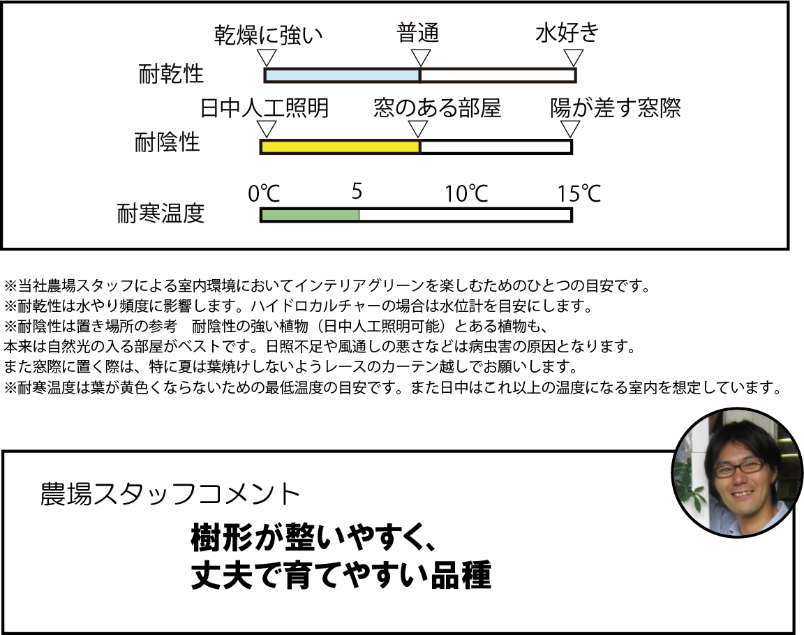 耐陰性ありますが、濃い緑で美しく丈夫に育てるには日当たりも大切です。窓のあるお部屋に置いてください。寒さにも比較的強いですが、冬場は5度以上の場所に置きましょう。