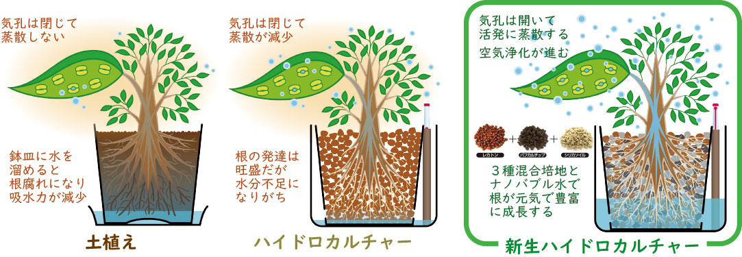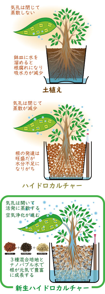 ハイドロカルチャーによる蒸散能力は土植えの植物よりも格段に高く、植物の持つ空気浄化機能を最大限に引き上げることができます。